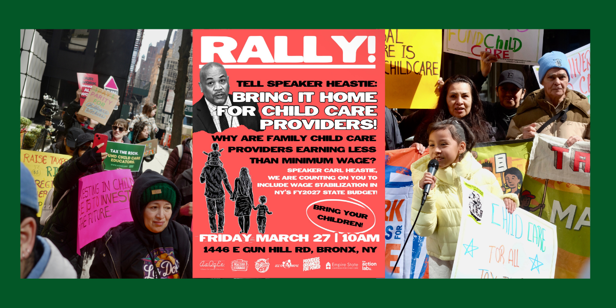 You’ve seen what’s on the table. The Senate stepped forward with $500 million for the child care workforce — the Assembly and the Governor did not. The Assembly took a step to expand access to CCAP by eliminating its minimum earnings requirement — the Senate and the Governor did not. Now that all of their priorities have become plain for us to see, New Yorkers have been showing up to make it clear that these are priorities that cannot be left out of this year’s budget. Last week, we rallied outside Governor Hochul’s New York City office. This Friday, we’re bringing that same energy to the Bronx, outside Speaker Heastie’s office to make it clear that these investments must be included in the enacted budget.